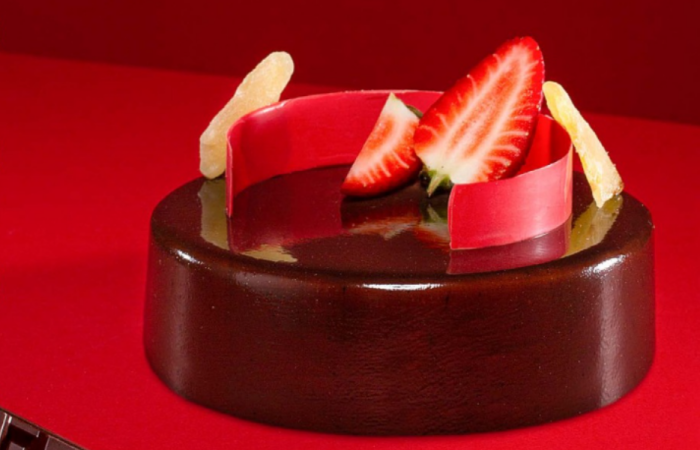 Torta con biscotto alle mandorle e cacao, dressata con mascarpone e cioccolato fondente: all’esterno una copertura lussureggiante di mascarpone vellutato e cioccolato fondente all’interno cuore di fragole e zenzero, che aggiunge una nota piccante-ibrida e fresca. Chiude una mousse al cioccolato fondente, intensa e avvolgente, che lega il tutto in un dessert raffinato dall’equilibrio tra biscotto, crema cremosa e note fruttate e speziate.